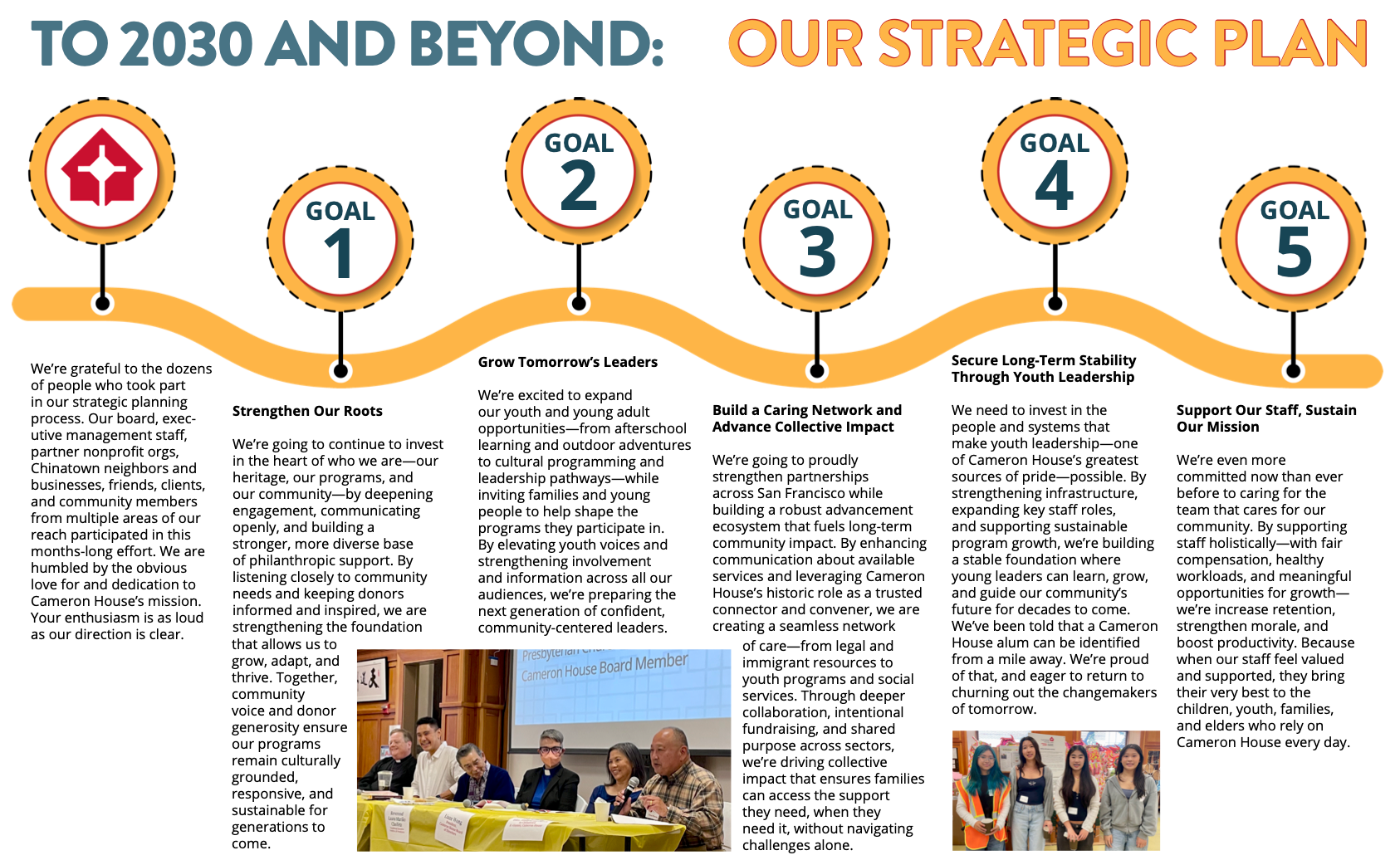 This Strategic Plan process was unprecedented in Cameron House’s history. It involved focus groups, collaborative community gatherings, staff and program participant surveys, and meetings big and small. Those who weighed included Chinatown neighbors and business owners, fellow nonprofit leaders, our full executive staff, and our full Board of Directors, led by Tom Hayashi and Jeanette Au of the Center for Volunteer and Nonprofit Leadership in Marin. This months-long endeavor saw to fruition a stunning roadmap that we all can agree on. With these goals in mind, we’re moving forward together, onward and upward.
